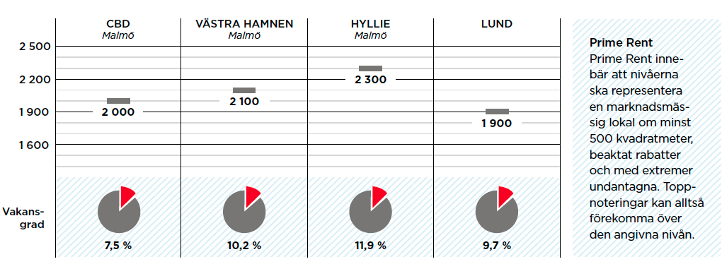 På delmarknadsnivå är Malmö CBD på stark framfart. Av marknadens totalt 77 000 kvadratmeter kontorsyta under produktion är cirka 44 000 kvadratmeter belägna på just den delmarknaden. Fram tills nyligen fanns den stora majoriteten av nyproducerade kontorsytor på andra delmarknader, vilket fick hyresgäster som var på jakt efter dessa effektiva ytor att söka sig till andra områden, framförallt Västra Hamnen och Hyllie.