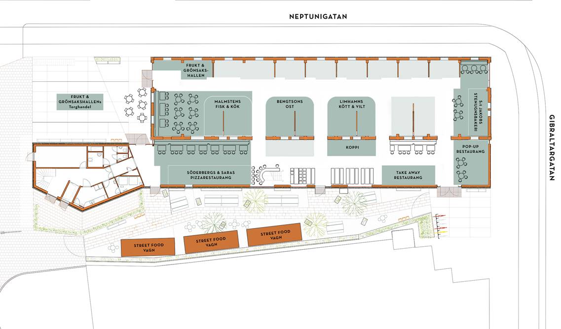De fem första hyresgästerna är Malmstens Fisk & kök, kafferosteriet Koppi, Limhamns Kött & Vilt, Bengtsons Ost, samt Frukt- & Grönsakshallen. Vid det första spadtaget presenterade och bjöd aktörerna på lite godsaker från sina respektive sortiment, som innehöll allt från ostron till kaffe tonic. På plats fanns även Gert Wingårdh och Joakim Lyth från Wingårdh Arkitektkontor. Ambitionen är att man ska kunna handla hela matkassen i saluhallen, enligt Martin Karyd.