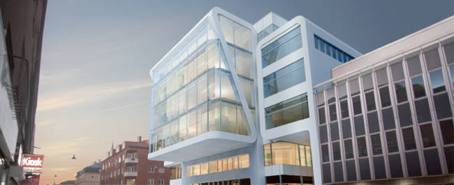 Skyltläge. Konceptbild på den nya byggnaden som kommer att ligga i ett bra skyltläge precis vid gågatan i centrala Uppsala.