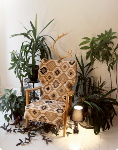 En klassisk Dux-fåtölj från 50-talet har förvandlats till en skandinavisk hövding som krönts med ett renhorn. I Modern Stories möbelstudio designas gamla möbler om, ingen blir den andra lik. Unikt, snyggt och miljösmart.