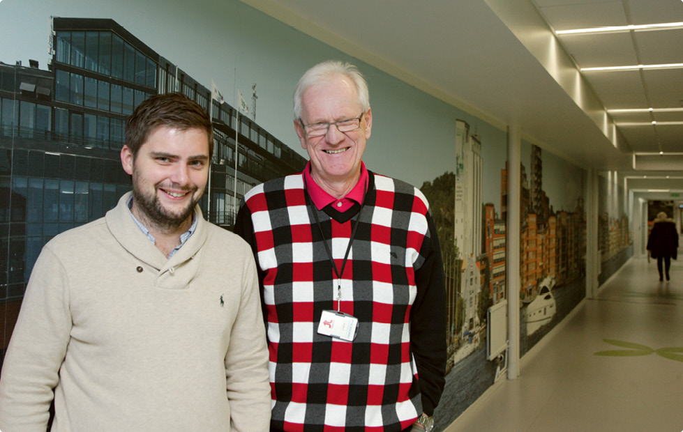 Över 160 meter långa fototapeter har satts upp i samband med att Newsec har renoverat Skatteverkets kontor på Rosenlund. "Det är väldigt uppskattat av medarbetarna", säger Skatteverkets Börje Hermansson, till höger, som poserar tillsammans med Carl Petre, uthyrningsansvarig på Newsec Asset Management.