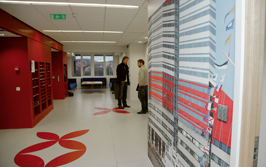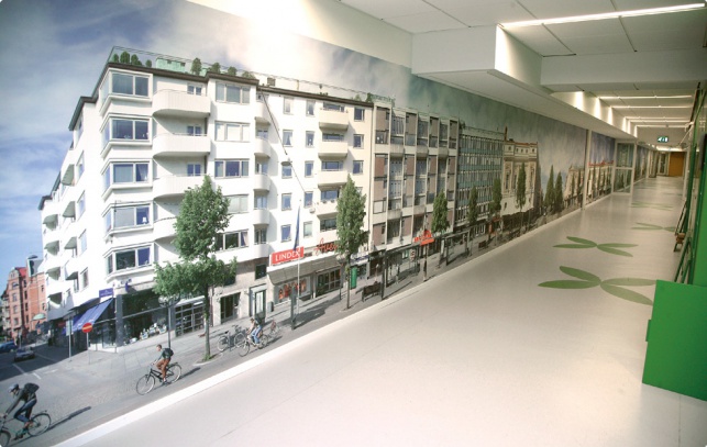 – Det blir lätt en sjukhuskänsla av långa, vita korridorer, det här är ett sätt att komma bort från det. Syftet är att man inte ska fokusera på korridorslutet. Vad vi vet är detta Europas längsta fototapeter, säger Carl Petre, uthyrningsansvarig på Newsec Asset Management, som förvaltar fastigheten på uppdrag av ägaren tjänstepensionsbolaget Alecta.