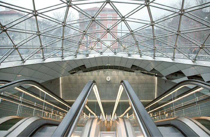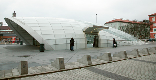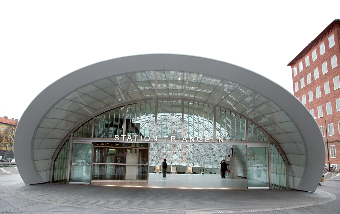 Stationens två entrébyggnader i markplan består av skalkonstruktioner i metall som håller upp glaset. Alla glasskivor är unika och trekantiga. Men formen beror inte på stationens namn.