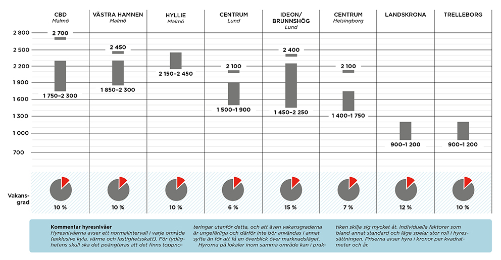 – De stationsnära lägena är generellt sett starkast. I Malmö är det ungefär samma betalningsvilja i Hyllie som vid Centralen och Triangeln. De senaste nyproduktionsprojekten har de högsta hyresnivåerna. I Lund har utöver centrum också Ideon och övriga lägen med närhet till E22 stark dragningskraft. I Helsingborg är Berga också attraktivt för att vara ett mer externt läge.