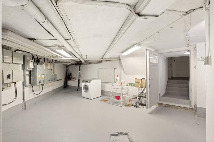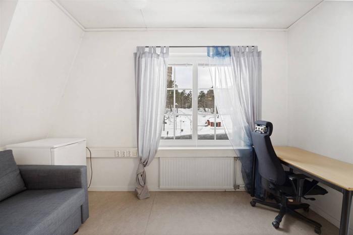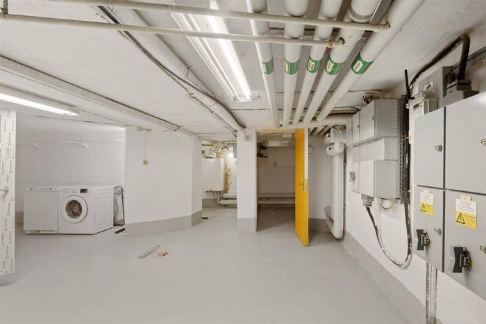 Källaren har kontor med två rum, pannrum, förråd och tvättstuga.