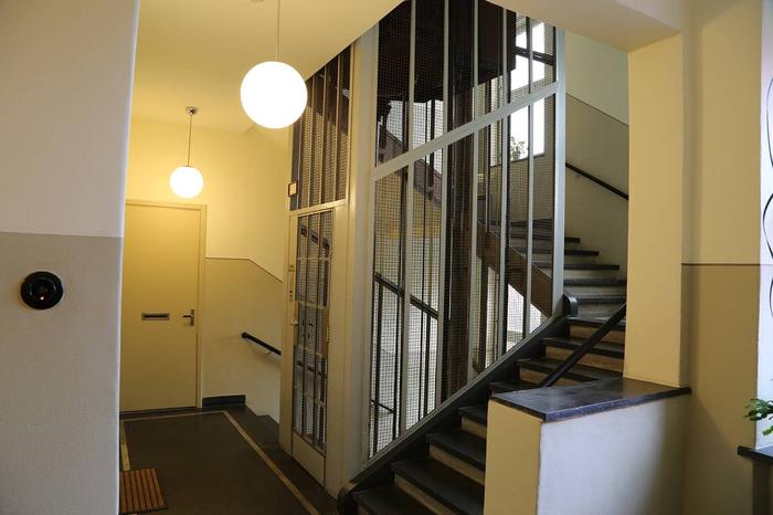trapphus i terrazo med hiss. Vinden är oinredd med en takhöjd som skulle kunna