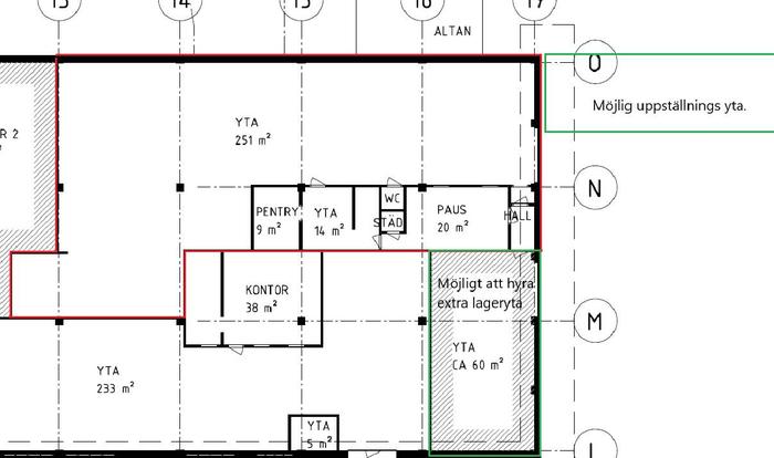Planlösning:Stor och flexibel yta med tillhörande kontor, pentry, wc och lunchrum.