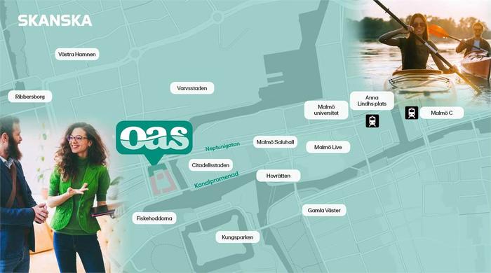 Oas ligger i Citadellsstaden, ett av Öresundsregionens mest dynamiska områden. Med hög koncentration av kontor, bostäder och service. Oas lockar med flexibla, hälsocertifierade och ljusa lokaler med 4,5 meter högt i tak och bra läge vid Neptunigatan.