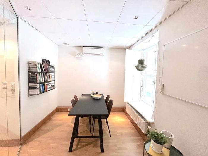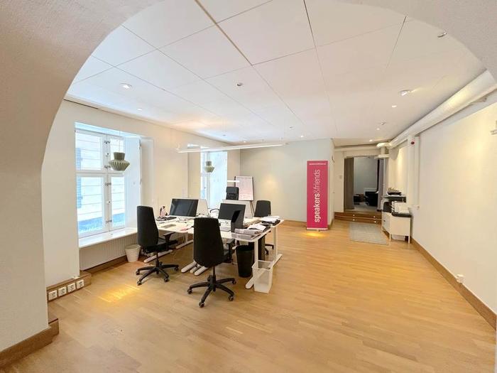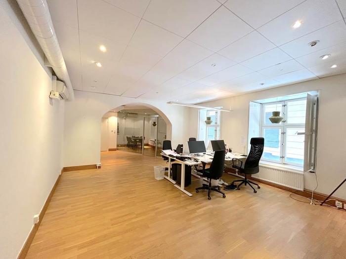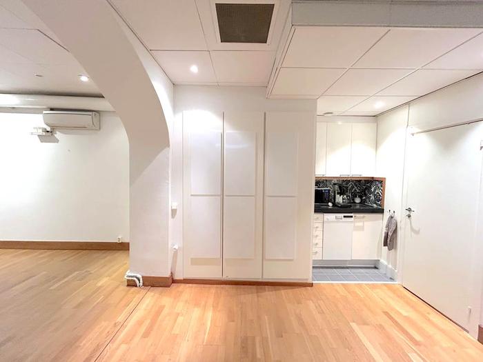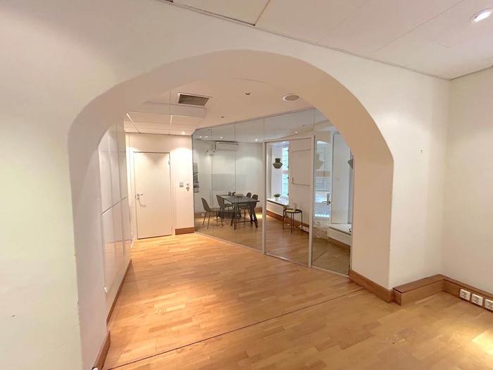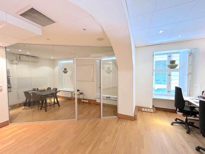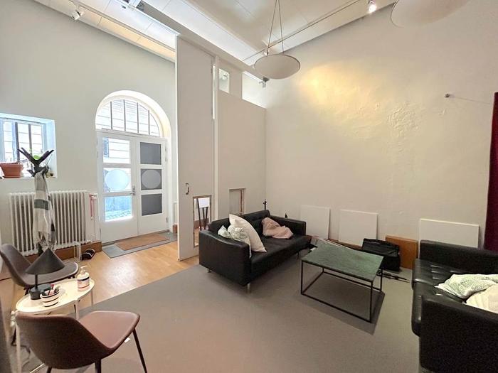 När du kliver in möts du av en separat del som passar utmärkt som studio eller social yta, en välkomnande plats för både arbete och umgänge. Med sina 85 kvm erbjuder den en mångsidig yta som lämpar sig lika bra som showroom, kontor eller kreativ studio. Lokalen består av två separata rum, ett stort öppet utrymme och en glasad konferensdel som skapar både rymd och transparens. De generösa fönstren längs hela fasaden släpper in rikligt med ljus och ger direktkontakt med den levande gatumiljön utanför.