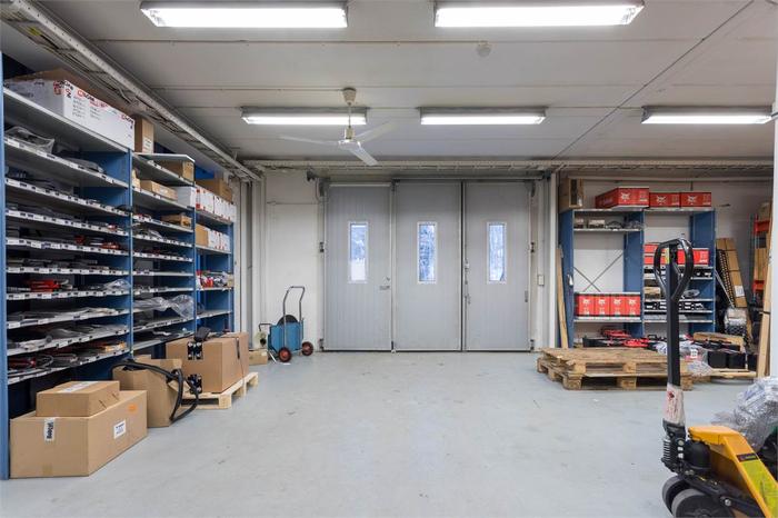 I nedre planet finns idag en större lager och verkstadsyta med 6 m i tak, in till ytan finns stora portar varav en om 3,9X 4 m som möjliggör bra inlastningsmöjligheter.