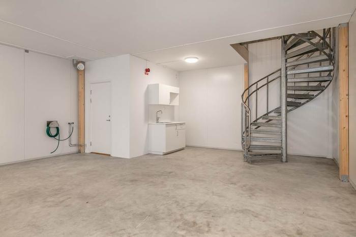 En av de stora fördelarna med denna lagerlokal är den praktiska entresolen, som ger en extra nivå för kontor, förvaring eller annan verksamhet. Entresolen maximerar användningen av golvytan och gör det möjligt att separera olika delar av verksamheten.