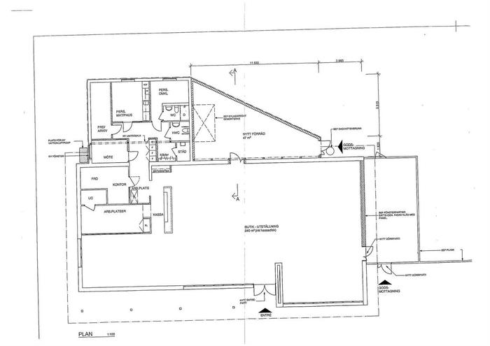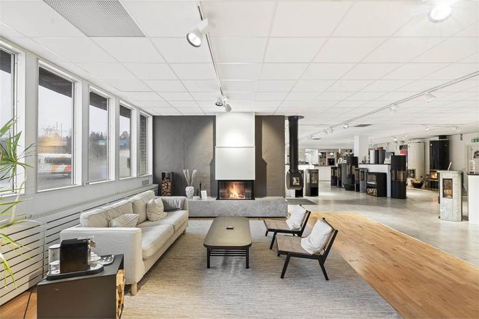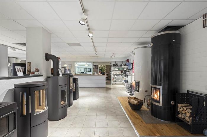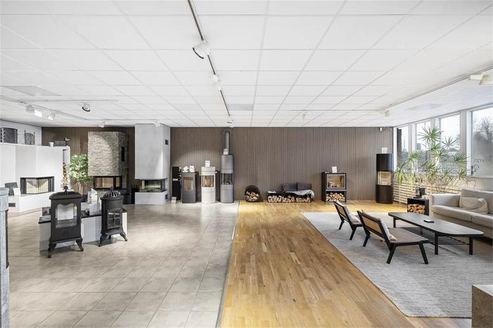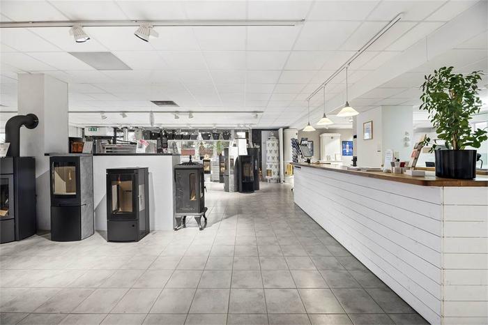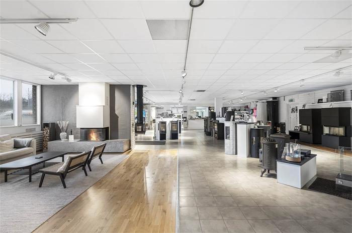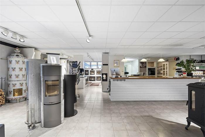 Byggnaden om 400 kvm inrymmer en stor butik- och försäljningsyta med reception längst in. Där finns också kontorsrum och personalrum med kök, WC och dusch.