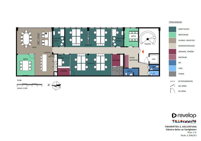 Planlösning:Öppen planlösning som enkelt kan anpassas utifrån era behov. I dagsläget finns ett avskilt pentry, två WC samt dusch.