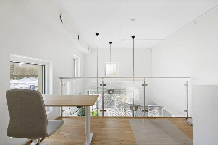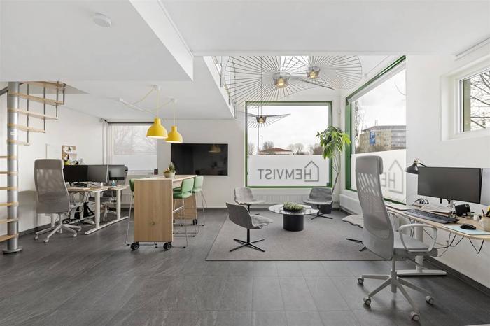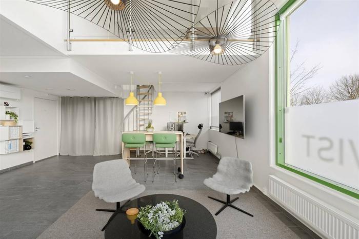 Öppen planlösning med stora fönsterpartier och generös takhöjd. När du kliver in i lokalen möts du av ett stilrent pentry, vidare finns det en stor öppen yta som passar utmärkt för butik eller kontor. Idag är lokalen inredd för 3 kontorsplatser samt lounge del med tillhörande matgrupp. Det finns även ett entresol om ca. 10 kvm. Lokalen har en modern RWC med tvättpelare.