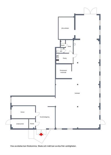 Via dubbla glasdörrar kommer du in i en kundmottagningsdel. I denna del finns även kontor. Själva verkstads/lagerdelen nås även via en större garageport. Lokalen har en takhöjd på ca 2,90 förutom där ventilationen är installerad och tar lite av takhöjden. I verkstadsdelen finns även en liten personaldel med pentry och omklädningsrum med WC och dusch. Kundmottagning/kontorsdel har klinkergolv och verkstadsdelen har målat betonggolv. Nuvarande hyresgäst flyttar ut i mars 2024 och denna hyresgäst har varit i lokalen under väldigt lång tid varför lokalen troligtvis behöver en uppgradering innan ny hyresgäst flyttar in. Därför har du stor möjlighet att påverka utformningen av lokalen.