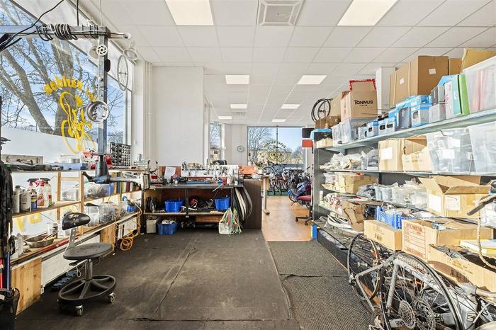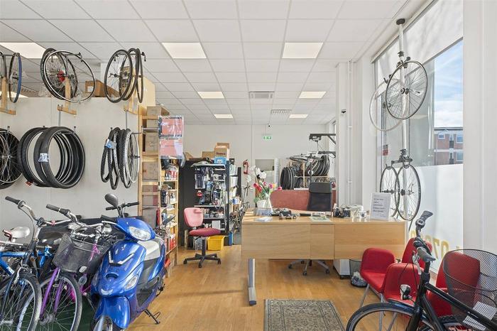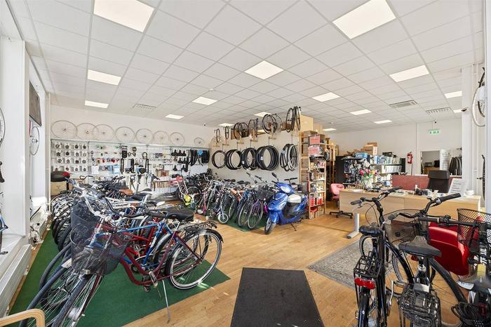 Butikslokal med hörnläge och stora fönsterpartier. Lokalen erbjuder stor öppen yta för både butik och reparation av cyklar. Det finns även personalutrymmen i form av pentry och WC.