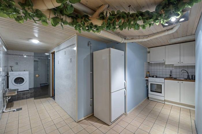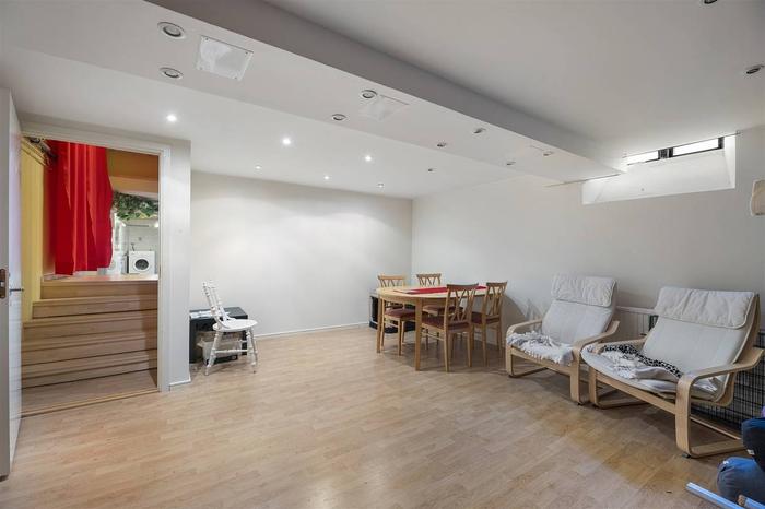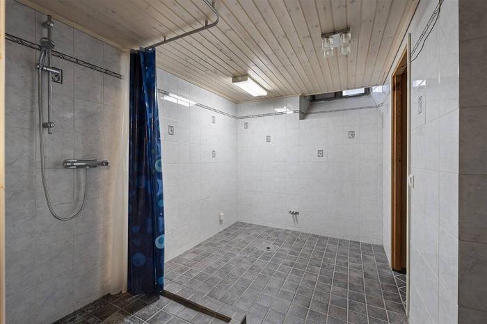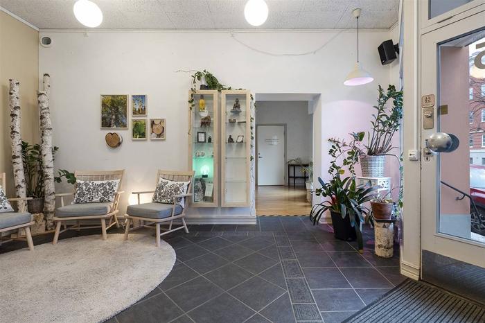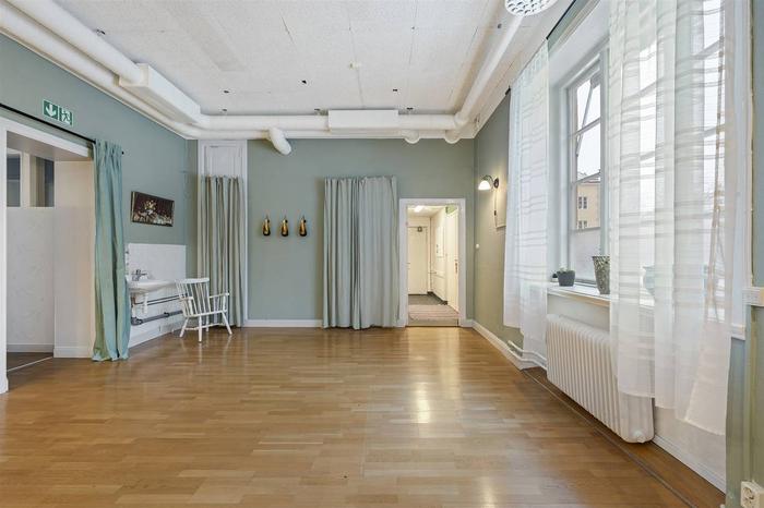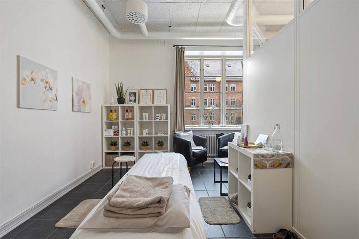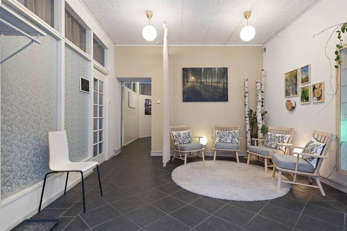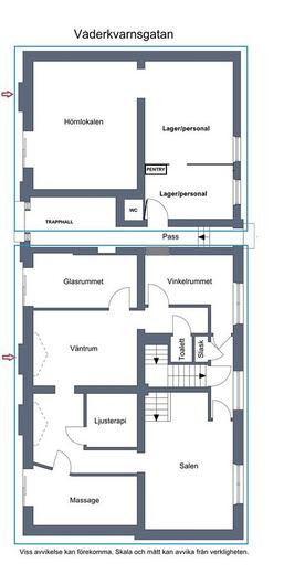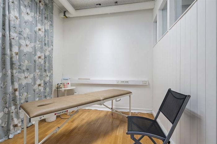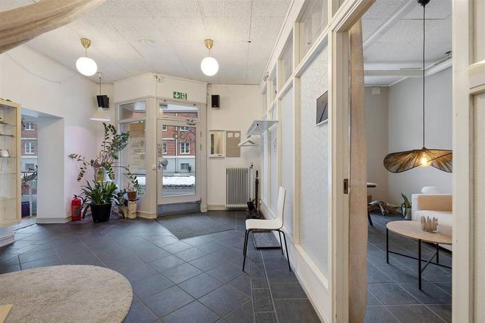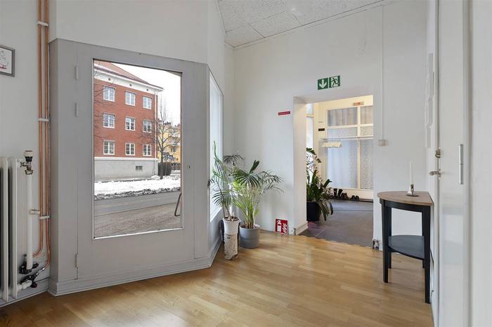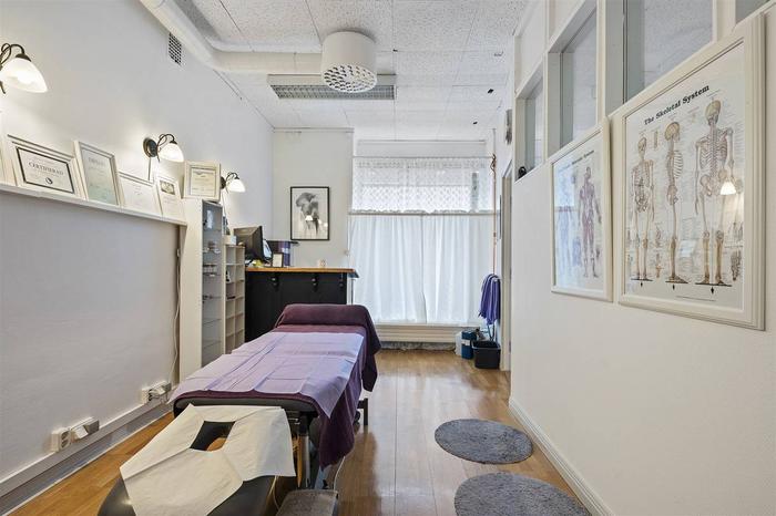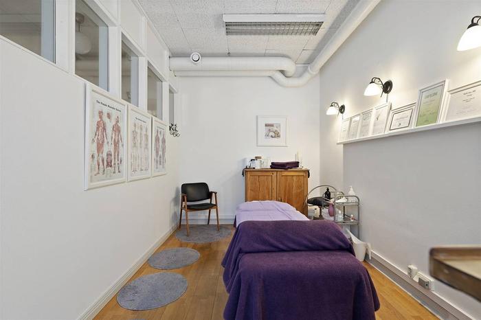 Här välkomnas du med en rymlig foajé/väntrum, flertalet behandlingsrum och en större sal/aktivitetsrum med handfat samt toalett. Tidigare var ytorna i denna lokal två enheter (77+63 m²) och det går med enkelhet att dela av då lokalen har två entréer. Utöver detta ingår även källarplanet som nås via en trapp från lokalen. Källaren inrymmer pentry/personaldel, tvättutrymme, toalett och dusch. Här finns också ett separat stort varmlager/förråd med intilliggande mindre förråd.