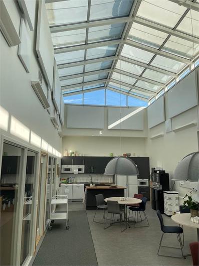 Ett ljust och inbjudande lunchrum skapar trivsel, med en atmosfär som för tankarna till en innegård