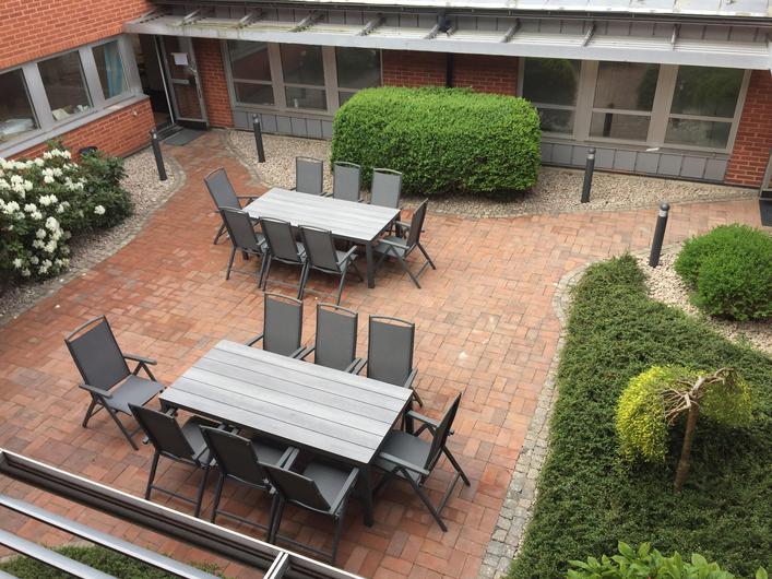 Fastigheten håller hög säkerhet med staket och grindar (stängt efter kontorstid - samtidigt mycket lättåtkomligt med bl.a. appbaserade låslösningar), har gott om parkeringar och är välförsett med tillgång till högkvalitativ fiberanslutning. Hyresgäster i fastigheten har tillgång till skyddad innergård utrustad med utemöbler och grill.