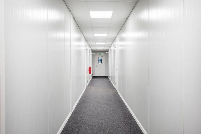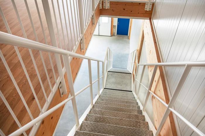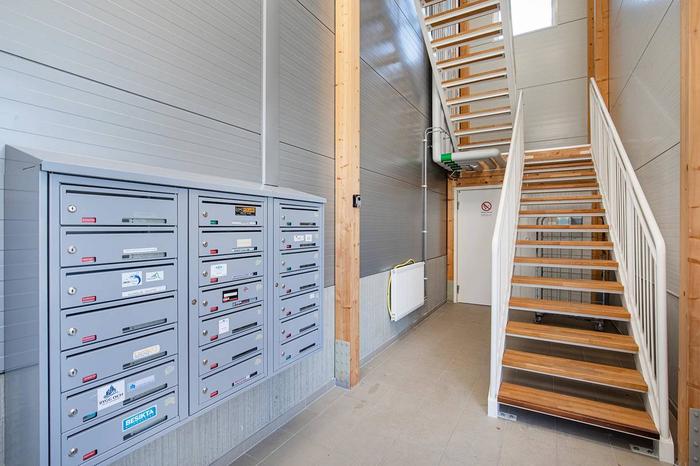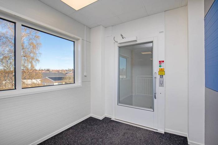 Plan 2: Kontor och personalutrymmen ca 90 m², nås via invändig trapp samt via korridor från externt trapphus med hiss i byggnadens gavel. Modernt kontor med öppet kontorslandskap, pentry, RWC med dusch och en välkomnande entréhall.