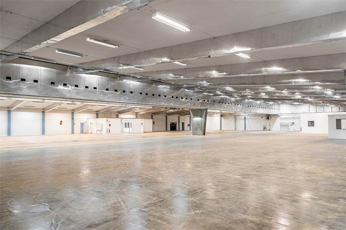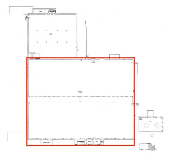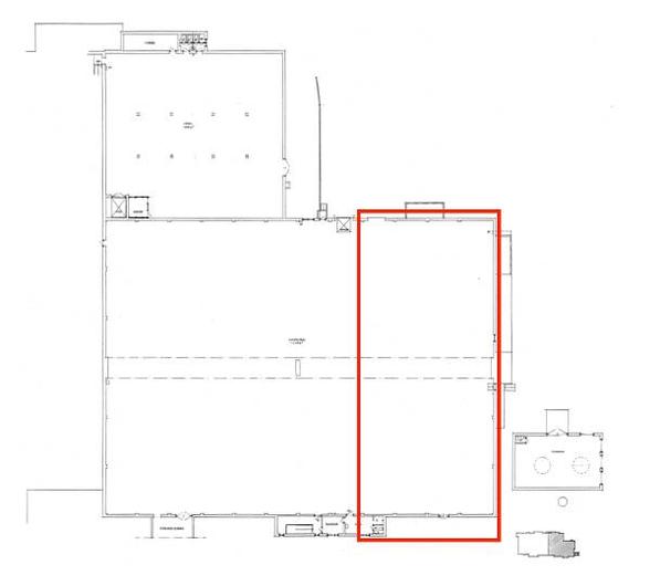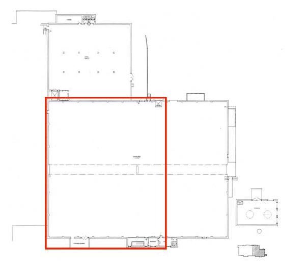 Planlösning:Stor lageryta med tillhörande kök, lunchrum, wc, kontor och konferensrum.