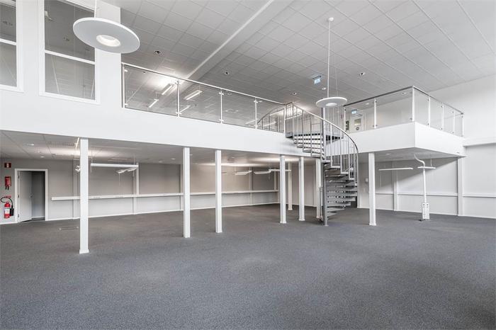 Lokalen är i dagsläget utformad för att effektivt kombinera lager, kontor, tillverkning och/eller verkstad inom samma enhet. Det innebär en låglagerdel om ca 1700 kvm, höglager om ca 700 kvm och kontor om ca 350 kvm. Höglagerdelen erbjuder en generös takhöjd om 7 meter, samt en lastport för smidig logistik. Kontorsdelen är modern och fördelad på två våningsplan i en entresollösning.