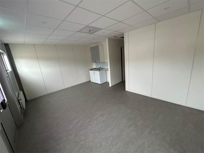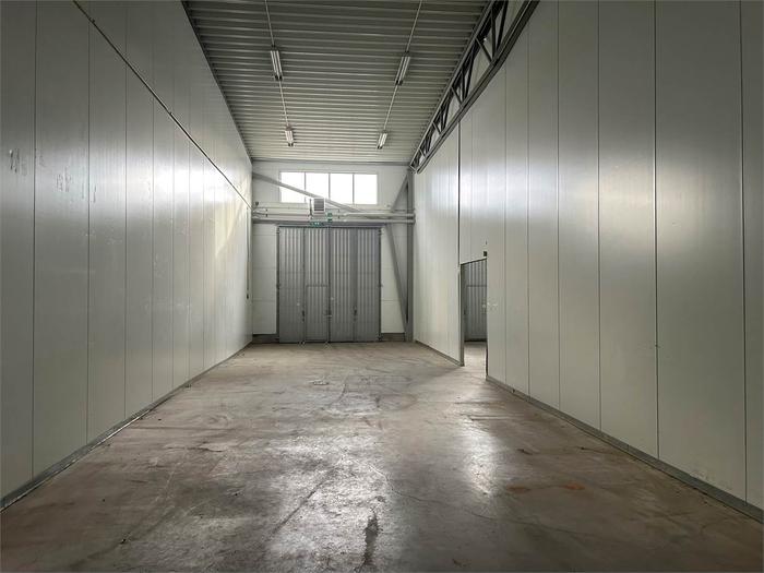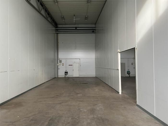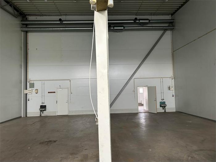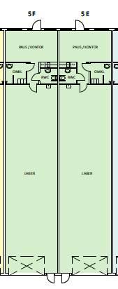 Planlösning:Två stora lagerytor sammankopplade med öppning. Kontorsdel med omklädningsrum/WC och pentry.