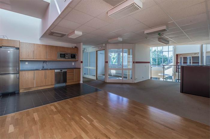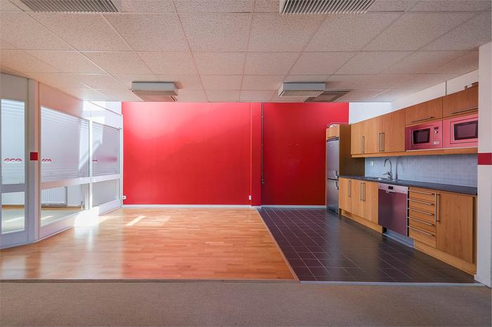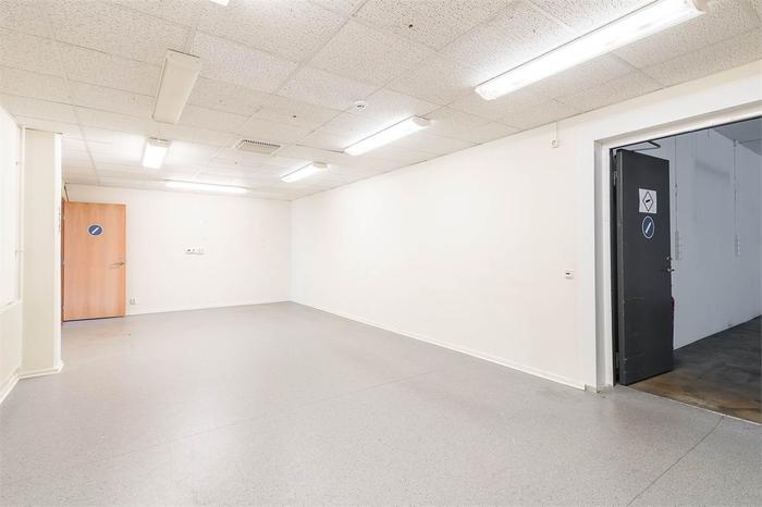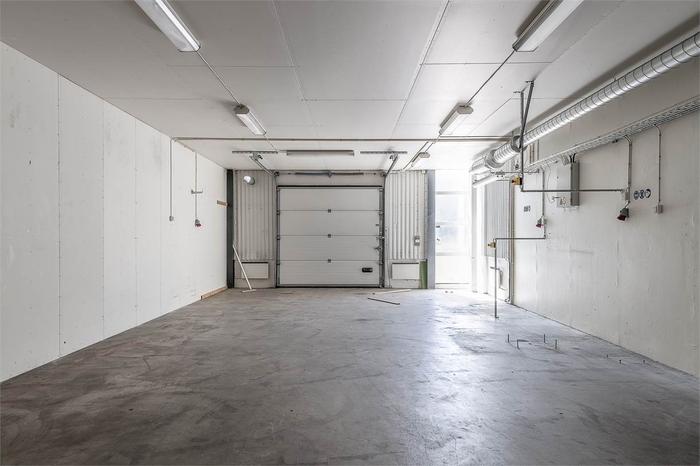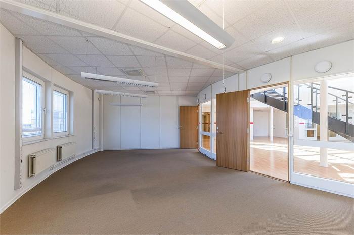Lokalens lagerdel om220 kvmligger i markplan och nås viaegen markport, vilket ger smidiga logistikflöden. Intill ligger kontorsdelen, fördelad på två våningsplan, medöppna ytor, mötesrum och generöst ljusinsläpptack vare stora glaspartier och takfönster. Interiören håller genomgåendehög standard, medpentry, WCoch genomtänkt design.