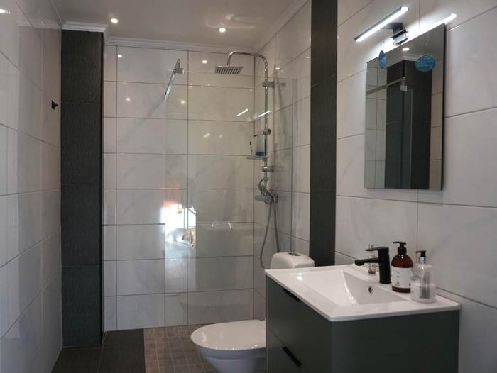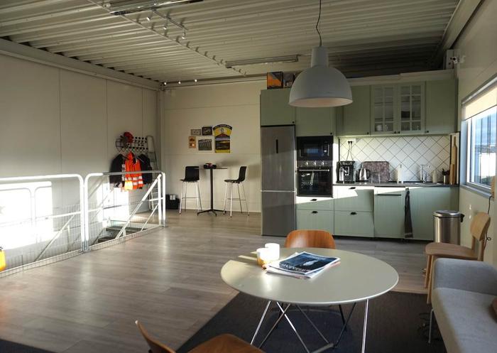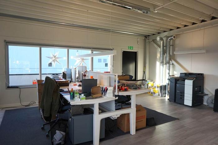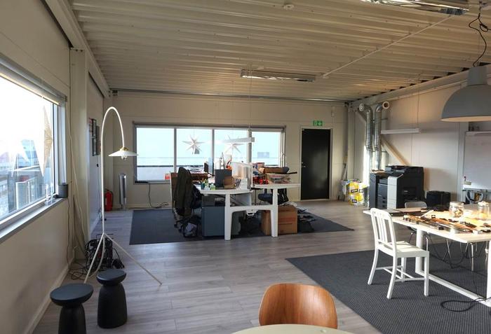 Övre plan är ett utmärkt showroom eller kontorsyta och allmän yta för personalen, här har man inrett med ett snyggt enstavigt laminatgolv i ekstil och vita väggar. Rummet är ljust och fint då det har ett flertal fönster för naturligt ljusinsläpp. Från detta rum har man utgång till en gemensam loftgång som är tänkt att fungera som en nödutgång. Detta skapar en möjlighet att separera detta rum/plan från övriga lokalen och hyra ut det. Här har man inrett med kök, badrum och gemensamhetsytor. Köket har köksluckor i grön nyans, delad kyl&frys, ugn, micro, diskho och inkopplat vatten. Badrummet har ett mörkt klinkergolv och vitt kakel på väggar, handfat, duschhörna.