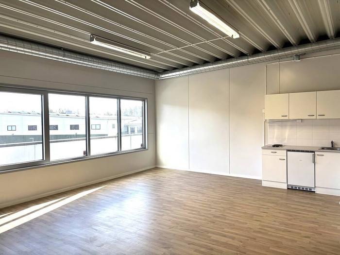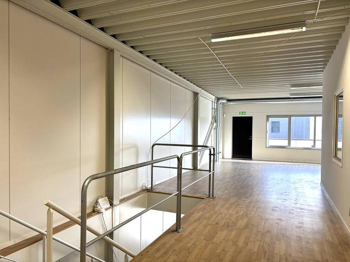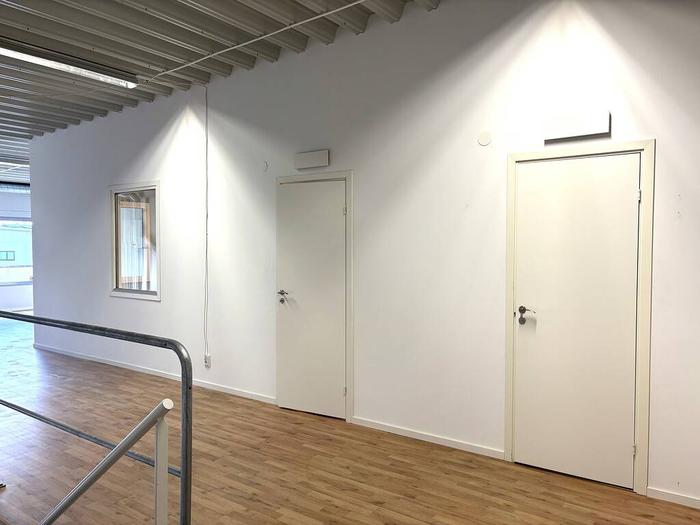 Övre plan är utmärkt för kontor och allmän yta för personalen men kan även användas till ex showroom, lageryta, callcenter. På detta våningsplan har man ett snyggt laminat innergolv, vita väggar och här har man inrett med kontorsrum, badrum, kökshörna och gemensamhetsytor. Det stora rummet är ljust och fint då det har ett flertal fönster för naturligt ljusinsläpp, här har man inrett med ett kök och matplats. Köket har två spisplattor, kylskåp med frysfack, grå laminatbänkskiva, diskho i rostfritt, överskåp med vita luckor och vitt kakel över bänkskiva. Det finns en utgång till en gemensam nödutgång vid brand bredvid fönsterpartiet. Badrummet har ett gråsvart klinkergolv och vitmålade väggar, wc, duschhörna med glasdörrar, handfat med underskåp, spegel med belysning, golvvärme (el) och ett snyggt innertak med belysning. Kontorsrummet har två fönster som ger ett bra naturligt ljus in i rummet.