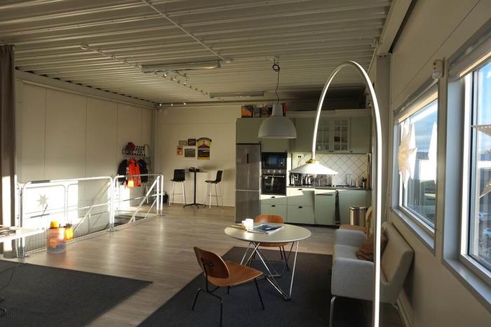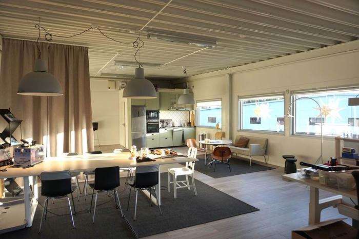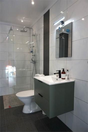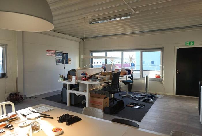 Övre plan är ett utmärkt showroom eller kontorsyta och allmän yta för personalen, här har man inrett med ett snyggt enstavigt laminatgolv i ekstil och vita väggar. Rummet är ljust och fint då det har ett flertal fönster för naturligt ljusinsläpp. Från detta rum har man utgång till en gemensam loftgång som är tänkt att fungera som en nödutgång. Detta skapar en möjlighet att separera detta rum/plan från övriga lokalen och hyra ut det. Här har man inrett med kök, badrum och gemensamhetsytor. Köket har köksluckor i grön nyans, delad kyl&frys, ugn, micro, diskho och inkopplat vatten. Badrummet har ett mörkt klinkergolv och vitt kakel på väggar, handfat, duschhörna.