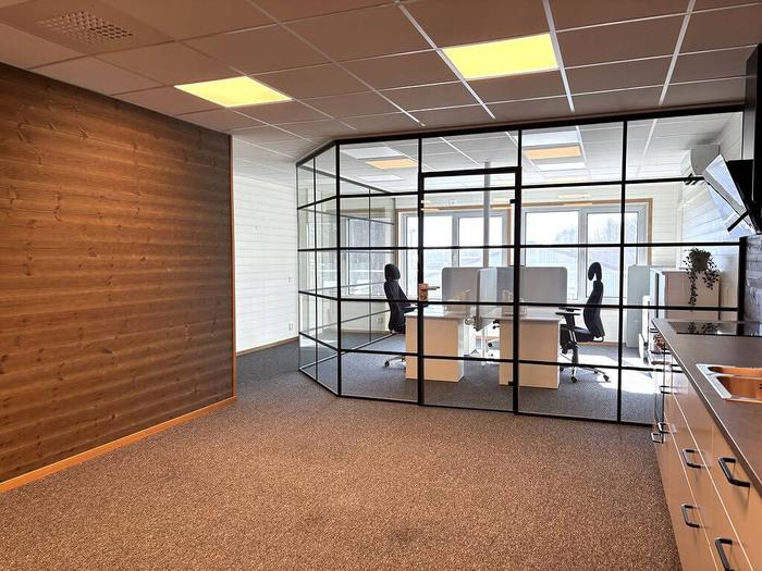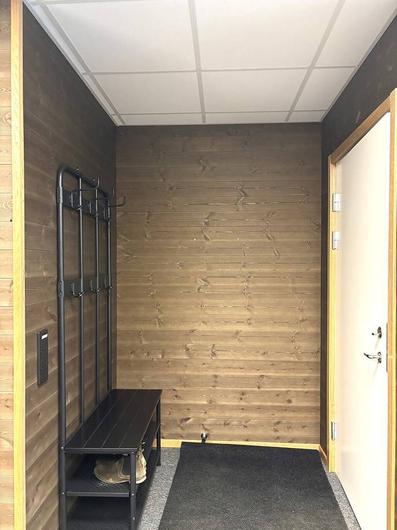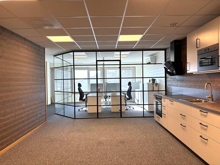 Övre plan har en mycket elegant och påkostad inredning med kontorsrum där väggarna är av glas med svart stålkonstruktion, innertak med inbyggd ventilation och påkostad belysning, ett snyggt innergolv i form av en gråsvart filtmatta och innerväggar med mörkbetsad träpanel. Köket är stilfullt med ljusgrå luckor, gråbrun bänkskiva, rostfri diskho, inbyggd micro, integrerad kyl & frys, inductions spishäll, inbyggd varmluftsugn i svart, svart spisfläkt och en integrerad diskmaskin, bra förvaring i ett flertal överskåp och lådsystem. Kontoret har vitmålad träpanel på vägg och gråsvart filtmatta på golvet, stort fönsterparti som ger ett fint naturligt ljusinsläpp, luftvärmepump, 5 el-uttag och 4 uttag för internet. Omklädnings- och duschrummet har ett grått klinkergolv med värme (el) och vitmålade väggar, duschhörnan har ett grått klinkergolv med mindre plattor och stora gråa kakelplattor på vägg, fint innertak med snygg belysning. WC har ett grått klinkergolv med värme (el) och vitmålade väggar, handfat med underskåp i grått, spegel med spotlightsbelysning, svart Tork inredning för tvål, toapapper och handdukar, fint innertak med snygg belysning. Städ och förrådsrum med gråsvart filtmatta på golv och vitmålade väggar.