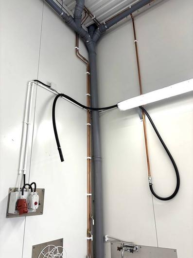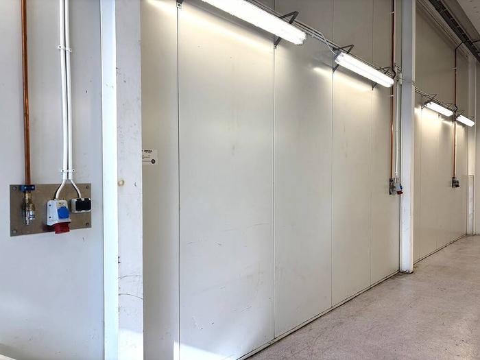 Lokalen mäter ca 196 kvm fördelat över två plan med en bredd på ca 6 m och ett djup på ca 16 m. Entreplanet är försedd med en vikport med måtten B 4,0 H 4,5 m, ett epoxymålat golv med oljeavskiljare, extra installerad belysning i tak och på väggsidorna, tryckluftssystem är installerat med 5 påkopplingsdon utfördelade på innerväggarna - systemet drivs av en kompressor som en köpare själv får ombesörja inköp av, generös takhöjd på ca 5 m där innertaket är ljudisolerat för att förhindra ljud upp till det övre planet, en installerad travers med elmotor - SleinbergSystems SBS-ECH-30, 8 st 3-fas uttag finns uppsatta på olika platser vägg samt 6 vanliga el-uttag, en mindre tvättho i rostfritt, behaglig värme via vattenburet golvvärmesystem (fjärrvärme).