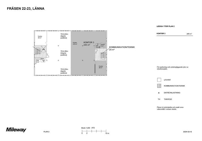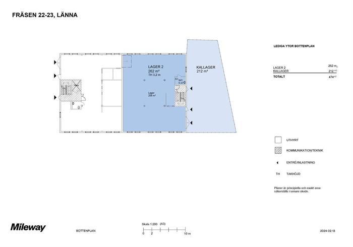 Lagerytan om 262 kvm ligger i markplan med en takhöjd på 3,2 meter och nås via en praktisk markport som möjliggör smidig in- och utlastning. Direkt intill finns ett kallförråd om 212 kvm - utmärkt för extra förvaring eller som stödytor till logistiken. På plan två ligger kontorsdelen om 245 kvm med öppen planlösning, och här finns även mötesrum, WC och dusch. Det finns möjlighet att installera pentry eller anpassa lokalen efter behov. Tillträde kan ske omgående.