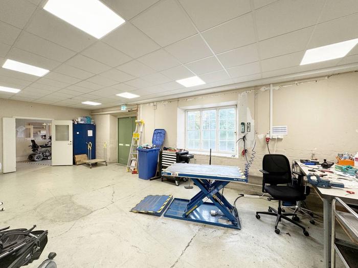 Lokalen om ca 415 kvm i markplan och erbjuder en flexibel planlösning som passar en rad olika verksamheter. Den stora, öppna ytan har en entré, markport samt en extra bred dörr för smidig in- och utlastning samt generöst ljusinsläpp via fönster längs hela långsidan. Utöver detta finns flera separata rum i varierande storlekar, lämpade för exempelvis kontor, verkstad, produktion eller lager´, finns tryckluft. Lokalen är även utrustad med personalutrymmen såsom kök, omklädningsrum, WC och dusch.