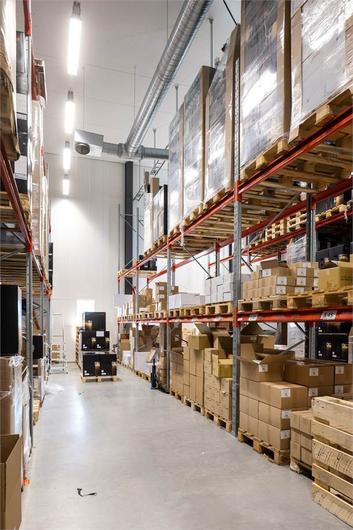 Lagret har tre industriportar med 4 m höjd. I dag blockerar en varu/industri-hiss två av portarna. Vid behov kan det tillbyggda produktionsplanet tas bort och på så vis får man +10 m i takhöjd samt att alla tre markportar blir tillgängliga. Lagerytan är ca 300 m2 med 5 m takhöjd och resterande del av markplanet består av kundentré med yta för exempelvis kundmottagning eller showroom, omklädningsrum inkl. duschar och bastu, toaletter och ett fullt utrustat kök.