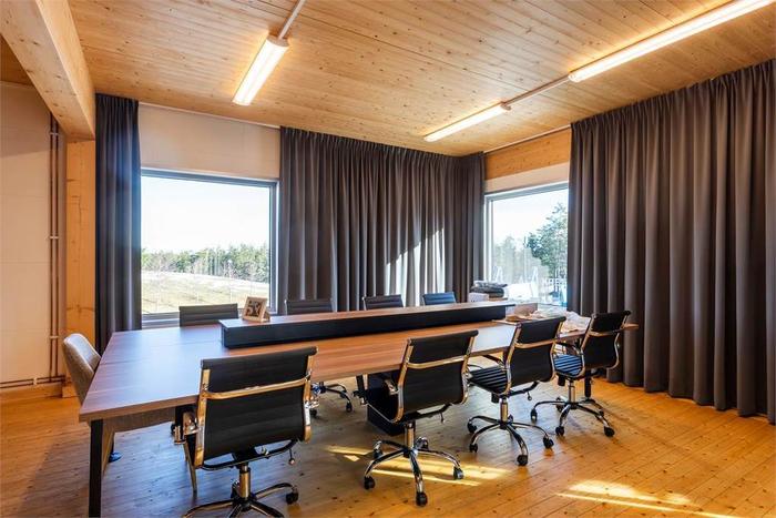 Kontorsplan med kontor, konferens, pentry, WC (ca 250 m2) samt 300 m2 lager/produktionsyta (denna del kan tas bort om man har behov för +10 m takhöjd i lagerdelen.