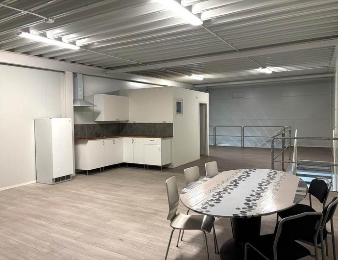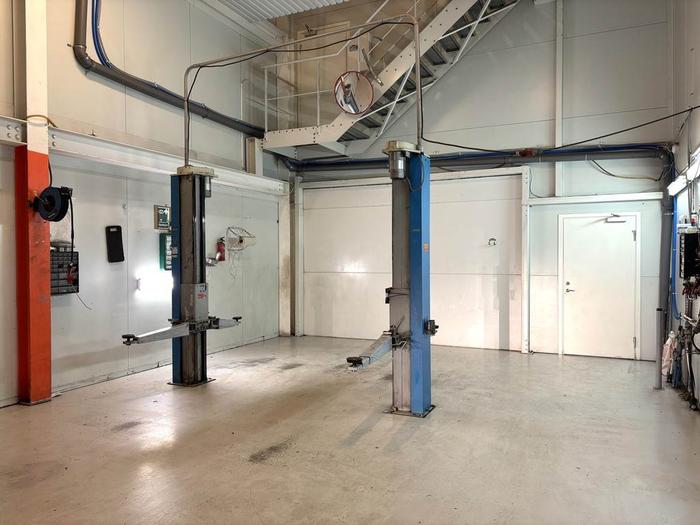 Lokalen har betonggolv målat med epoxyfärg på entréplanet samt gemensam oljeavskiljare, uppkopplad till kommunalt VA, indraget fiber. Det är vattenburet golvvärmesystem i entréplanet som ger en behaglig värme i lokalen och som ger en låg driftskostnad, endast ca 700 kr i värmekostnad och vatten för denna lokal. Vikport av högsta kvalitet om 4,5x4,0 meter, takhöjden i lokalen är drygt 5 meter. Övre planet är inrett med innergolv, ett stilfullt badrum med klinkergolv och helkaklade väggar med duschhörna och wc. Ett snyggt kök i vinkel med vita skåpluckor, träbänkskiva, spishäll, diskho och spisfläkt.