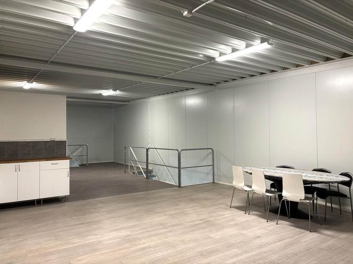 Lokalen har betonggolv målat med epoxyfärg på entréplanet samt gemensam oljeavskiljare, uppkopplad till kommunalt VA, indraget fiber. Det är vattenburet golvvärmesystem i entréplanet som ger en behaglig värme i lokalen och som ger en låg driftskostnad, endast ca 700 kr i värmekostnad och vatten för denna lokal. Vikport av högsta kvalitet om 4,5x4,0 meter, takhöjden i lokalen är drygt 5 meter. Övre planet är inrett med innergolv, ett stilfullt badrum med klinkergolv och helkaklade väggar med duschhörna och wc. Ett snyggt kök i vinkel med vita skåpluckor, träbänkskiva, spishäll, diskho och spisfläkt.