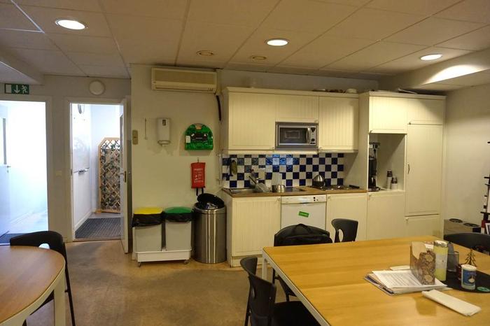 Byggnaden har en huvudentré och gemensamhets utrymmen såsom flera wc, omklädningsrum, tvättrum, bastu. Från lokalen finns en dörr som knyter an dessa utrymmen.