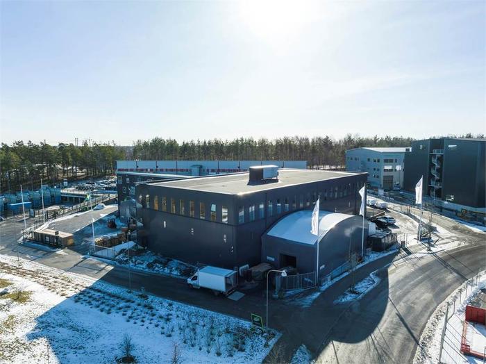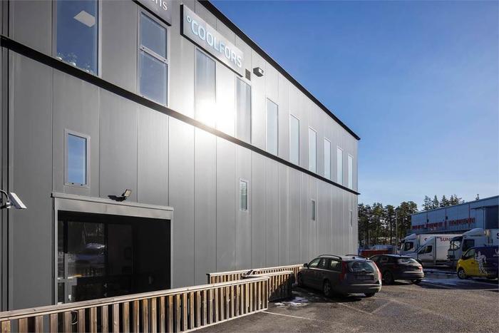 Modern miljöbyggnad med höglager, produktionsdel/ytterligare lager samt kontor.