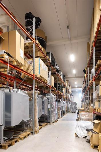 Höglagret har en takhöjd på 7-7,5 m med två elektriska vikportar (höjd 4 m). Lasthiss mellan lagret och övre plan finns.