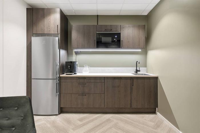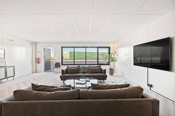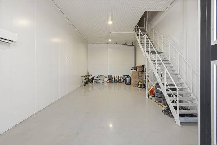 Lokalen om total 230 kvm är fördelad lika på två plan om 115 kvm vardera. Entréplanet välkomnar med en stor öppen lager- eller produktionsyta med generös takhöjd om ca 5 meter, port samt en entrédörr bredvid. Med trappa nås det övre planet som idag nyttjas som kontor samt lounge med inglasat konferensrum och pentry. Ytan är smakfullt inredd med nedsänkt innertak med infälld belysning och textilmatta på golv. Stort badrum med dusch och plats för tvättmaskin och/eller omklädningsskåp. Från kontorsdelen finns utgång till loftgång (ca 1,5 m bred) och härifrån når du hiss som finns belägen vid gaveln mot Grafikgatan.