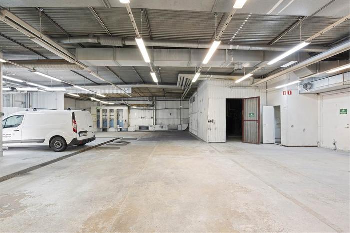 Lokalens 510 kvm fördelar sig på bland annat två större verkstadsytor där båda är tillgänliga genom vikport.