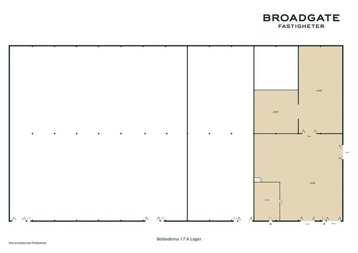 Lokalen erbjuder en generös takhöjd som är idealiskt för större maskiner och fordon och det finns flera portar. Det finns också en kontorsdel, omklädningsrum med dusch och WC