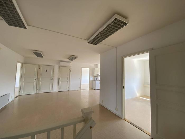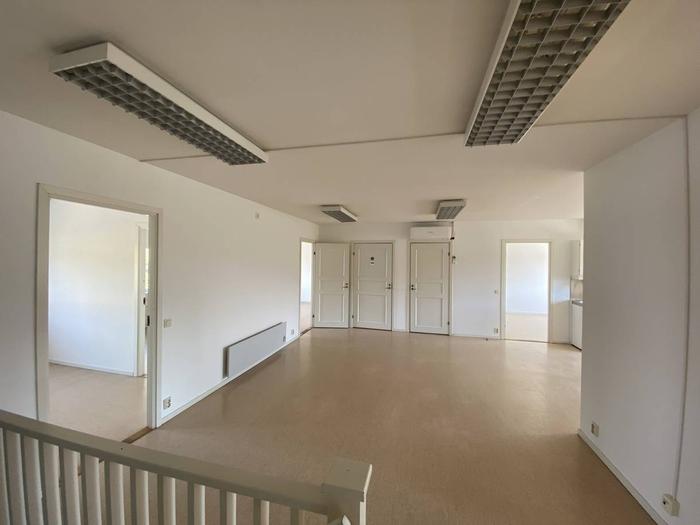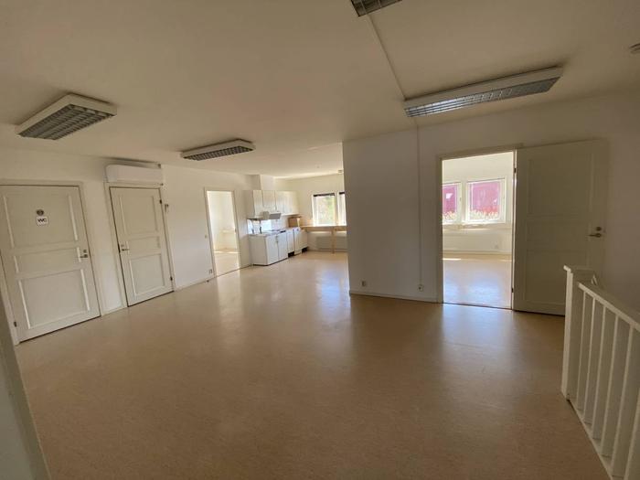 Övervåningen består av kontorsrum i olika storlekar, samt kök, wc och dusch.
