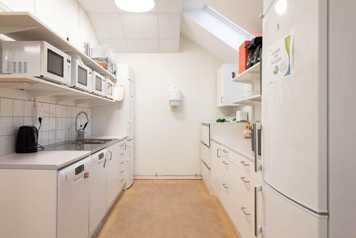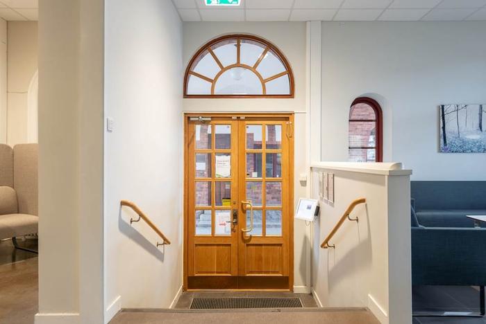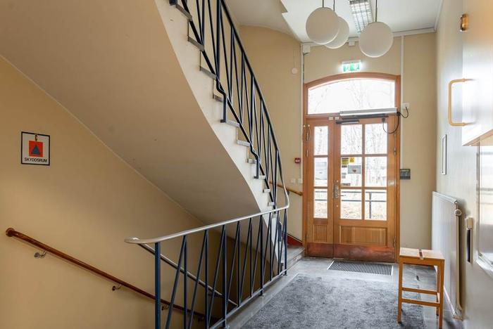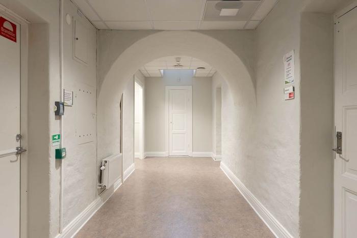 Planlösning:Välkomnande och ljus entré från den vackra portalen utanför leder in i entréplanet med såväl omklädningsrum som mötesrum och kontorsrum. Våningsplanet är i nuläget rumsindelat men med möjlighet att anpassa efter era behov. Trappor och hiss leder upp till andra våningen som utöver ytterliigare omklädningsrum, ett stort mötesrum och kontorsrum även inrymmer en större pausyta med pentry samt utgång till balkong på husets kortsida.