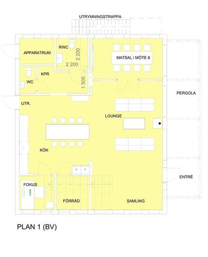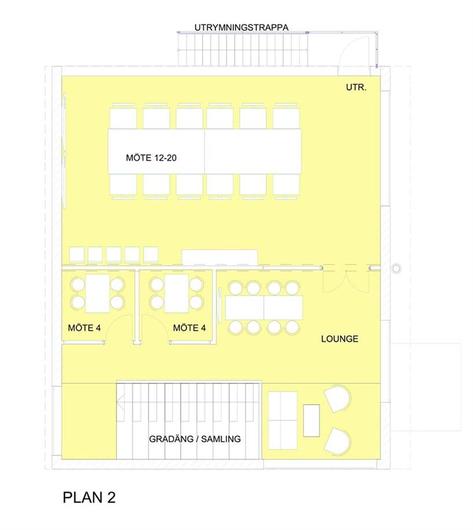 Planlösning:Via en trevlig pergola med uteplatser mot Lilldammen i Gimo kommer du via huvudentrén in i "hallen" som är öppen mot den stora loungen och kök med rejäl matplats. Från loungen har du fönster mot Lilldammen, Gimo Herrgård och den trevliga gångvägen med bro mot Gimo Herrgård. Via dubbeldörrar kommer du även till ett större mötesrum eller matrum om du så vill som ligger i hörnet med fönster såväl mot Lilldammen som åt gaveln. I det andra inre hörnet finns ett kapprum med RWC samt vanlig WC. Rakt fram från entrédörren kommer du via trappan upp till övervåningen. Väl uppe på övervåningen har du ytterligare lounge, två mindre mötesrum samt ett stort rum för stora möten eller för arbetsplatser. Såväl från loungen som från det större rummet har du en fantastisk utsikt med Gimo Herrgård i fonden och med Lilldammens vatten som en spegel i förgrunden. Från det stora rummet finns även en utvändig trappa främst för utrymning.