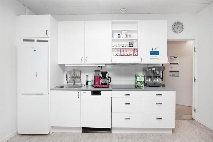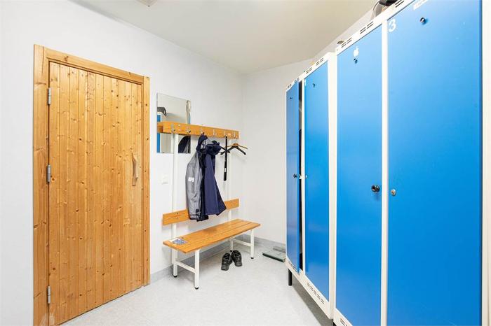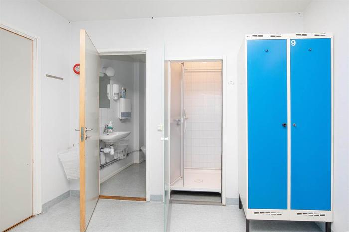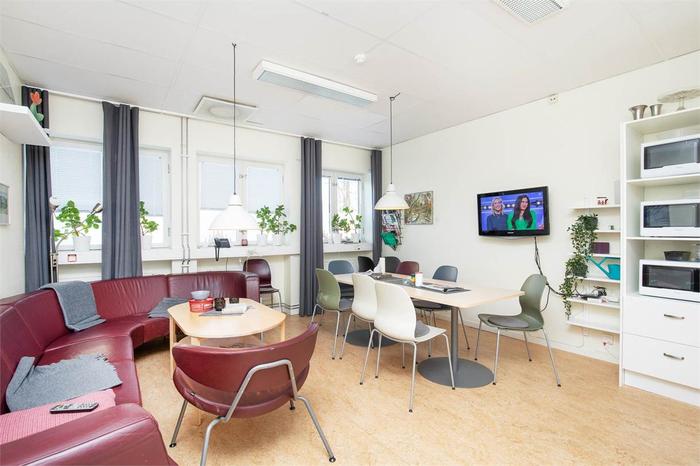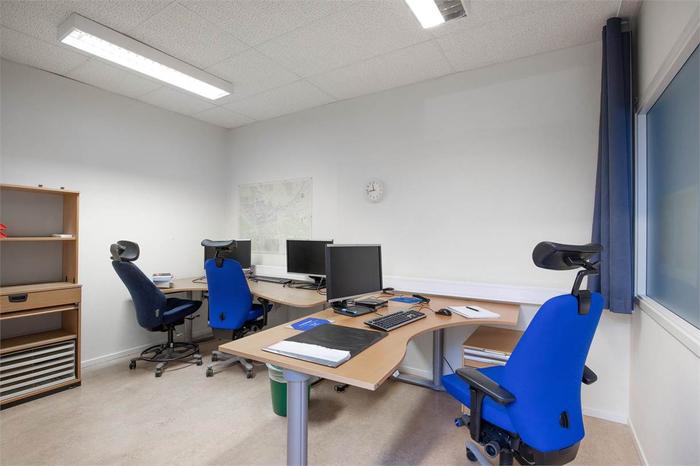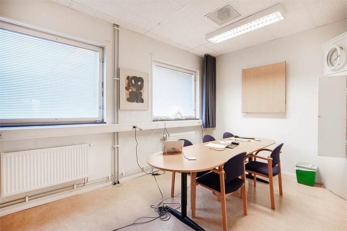 De fem kontorsrummen varierar i storlek och kan användas för olika ändamål. I lunchrummet finns ett pentry med kyl och frys, spishäll och diskmaskin. Lokalen inkluderar också två toaletter och två omklädningsrum med dusch, där ett av omklädningsrummen har en bastu.