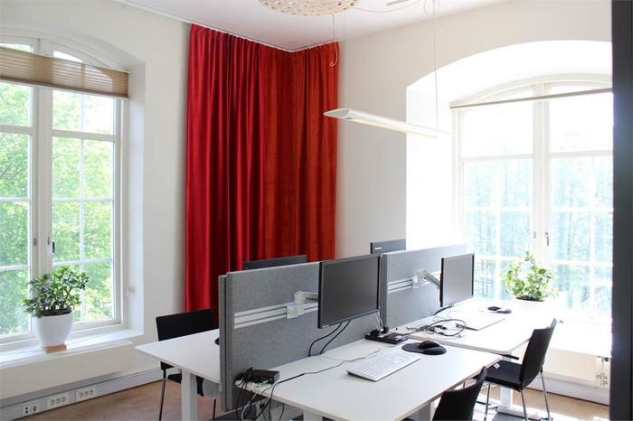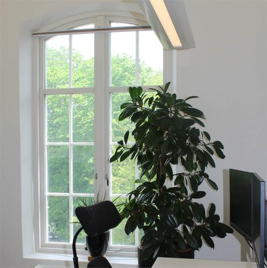 Lokalen har vackra detaljer med stora bågformade fönster och djupa fönservalv. Fint blickfång från skrivborden mot träddunge, viskan eller himmel och äldre tegelfasad.